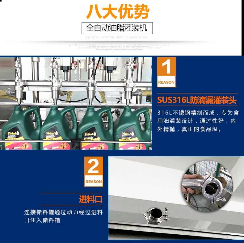 1.防滴漏灌裝頭由SUS316L不銹鋼精制而成,專為食用油灌裝設計,通過性好,內外精拋,真正的食品級.