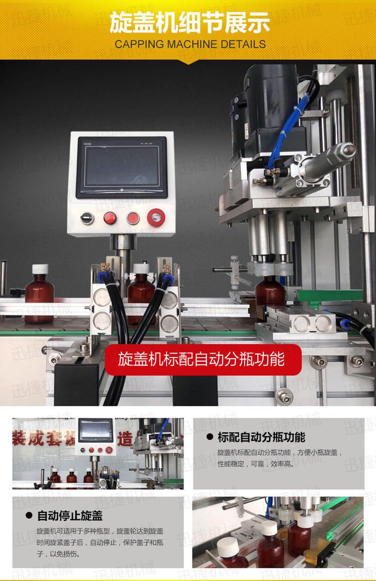 旋蓋優(yōu)勢有:旋蓋機(jī)擁有做到自動分瓶功能,當(dāng)瓶蓋旋緊時(shí)可自動停止旋蓋,保護(hù)了蓋子和瓶子免受損傷。塑料瓶消毒水灌裝機(jī)(小玻璃瓶溶液灌裝機(jī))整機(jī)由304不銹鋼材質(zhì)組成,灌裝效率和精度高,雙重保證您的物料的包裝效果。
