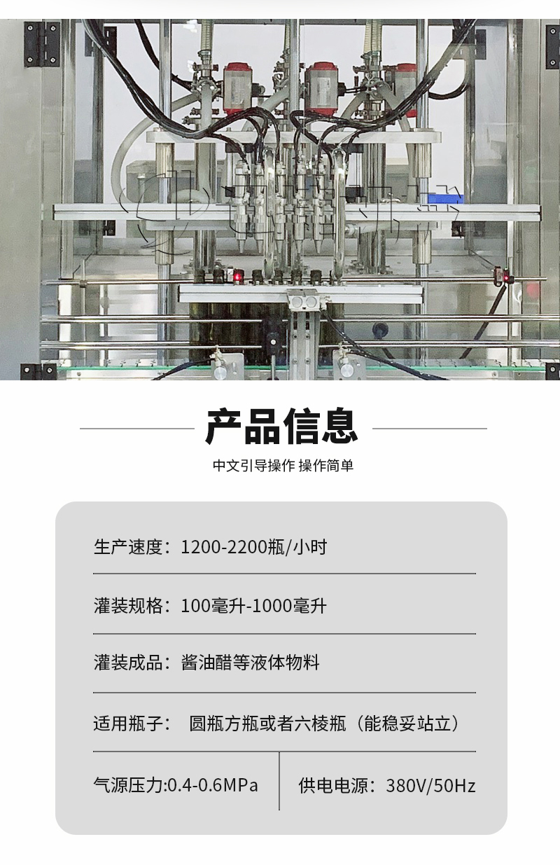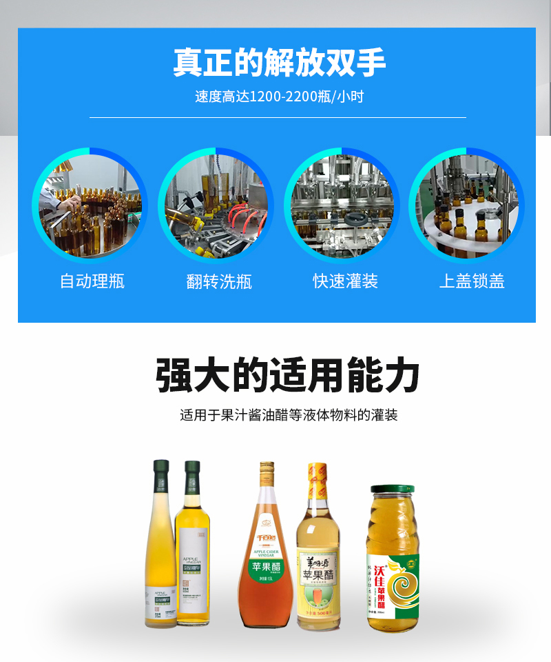 該系列果醋灌裝機采用伺服柱塞式計量灌裝原理,多項專利認證,適用于各種規格(0.1-1升可兼顧到2升灌裝)的液體灌裝。