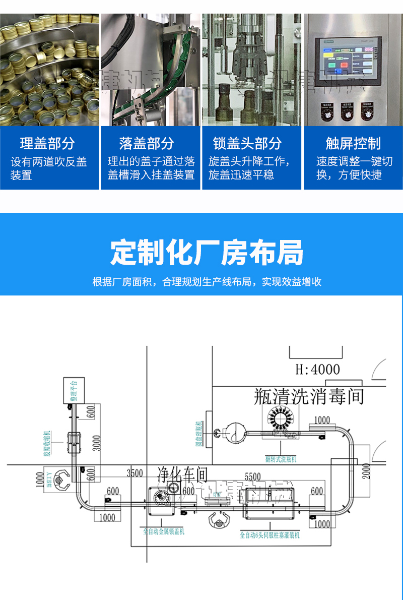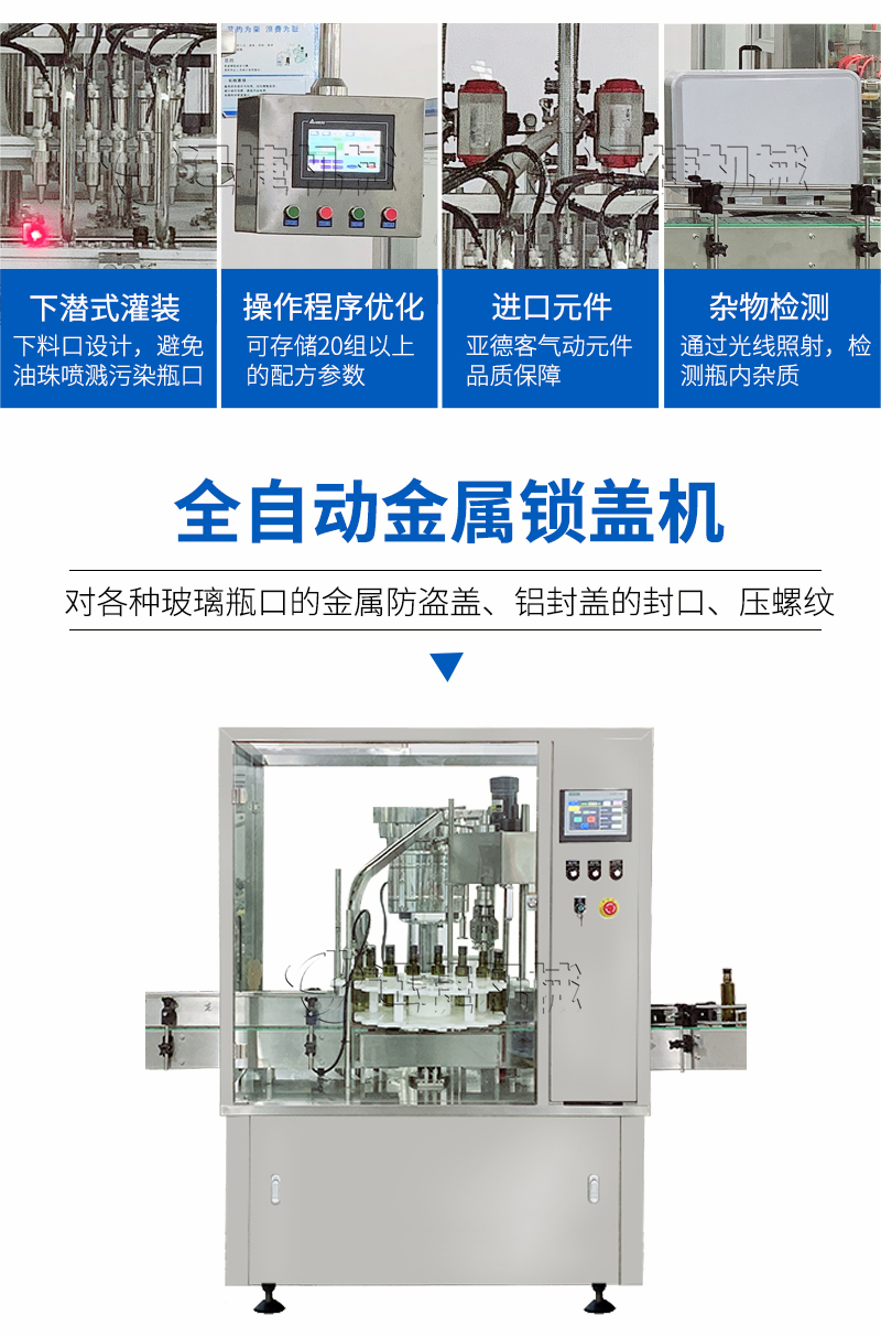 本設備適用于醫藥、農藥、食品、化妝品、化工等行業,主要針對各種玻璃瓶口的金屬防盜蓋、鋁封蓋的封口、壓螺紋等。該設備可單機使用,也可以與灌裝機等設備組成生產流水線自動作業;