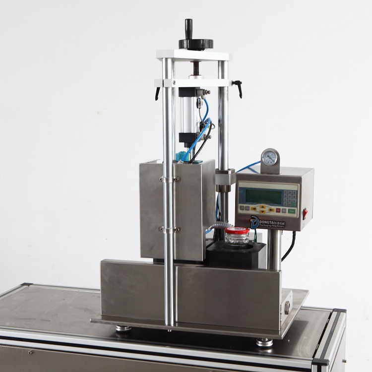 先從個(gè)詞半自動(dòng)來講,半自動(dòng)指的就是手動(dòng)與機(jī)器相結(jié)合的操作流程:半自動(dòng)玻璃瓶真空封口機(jī)是采用了人工上瓶,人工出瓶,機(jī)動(dòng)旋蓋與抽真空的方式來完成流程。由于人工上瓶,并且該半自動(dòng)玻璃瓶真空旋蓋機(jī)有無瓶不上蓋,無瓶不抽真空的特點(diǎn),所以大大減少了對(duì)瓶蓋與瓶身的損害。并且人工與機(jī)器的配合絲毫不浪費(fèi)時(shí)間,比純手工的生產(chǎn)效率要幾倍,還更節(jié)省人力,一臺(tái)機(jī)器只需一個(gè)人便可輕松完成。